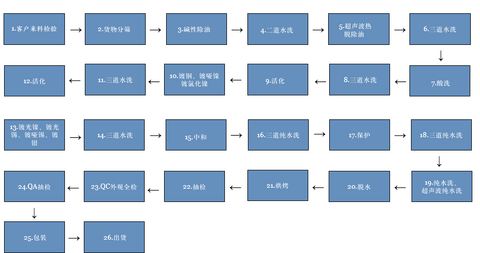 精密電鍍金(厚金、薄金);化學金;鍍銀(厚銀、薄銀);鍍銅(酸銅、堿銅、焦銅);化學沉鎳(中磷、高磷);電鍍鎳(可焊性鎳);亮鎳、啞鎳、半光鎳、氨基磺酸鎳);高溫鍍錫(啞錫、亮錫);化學沉錫;清洗鈍化;專業(yè)電鍍盲孔、深孔等高難度產(chǎn)品...